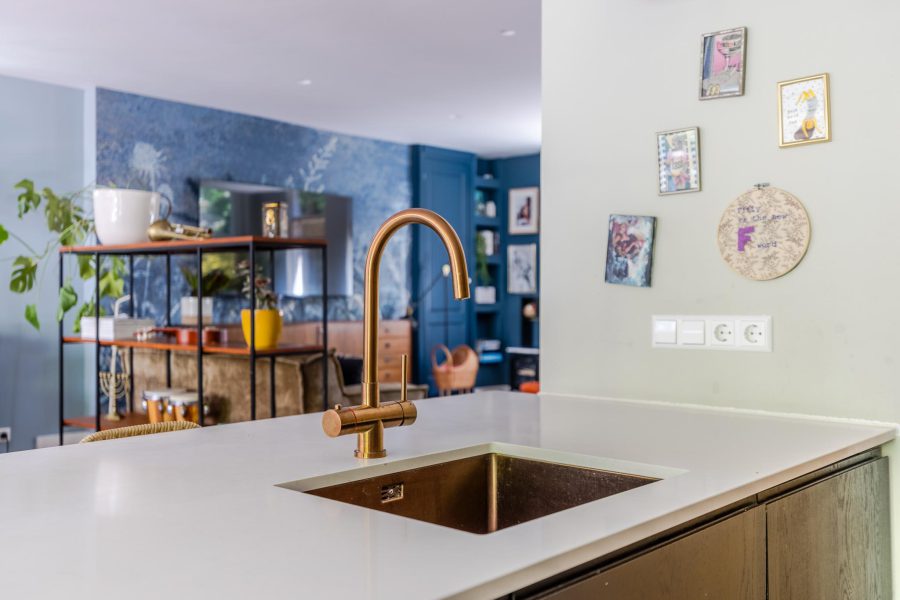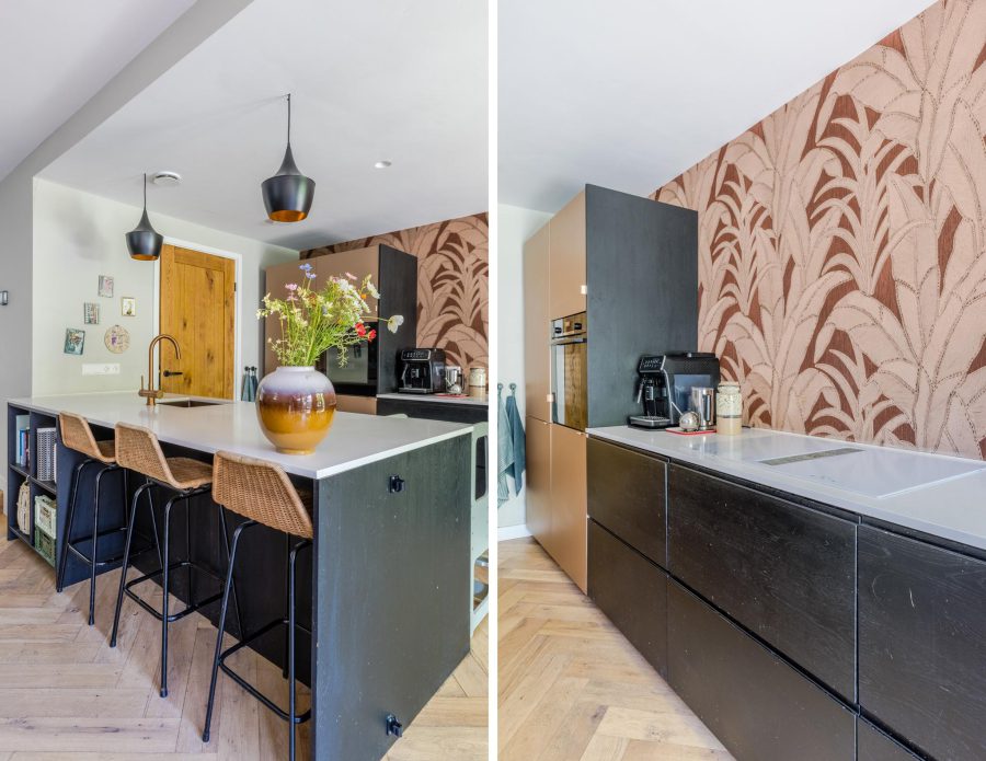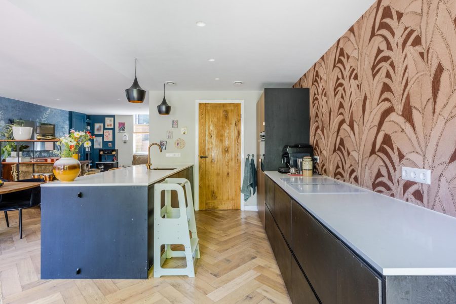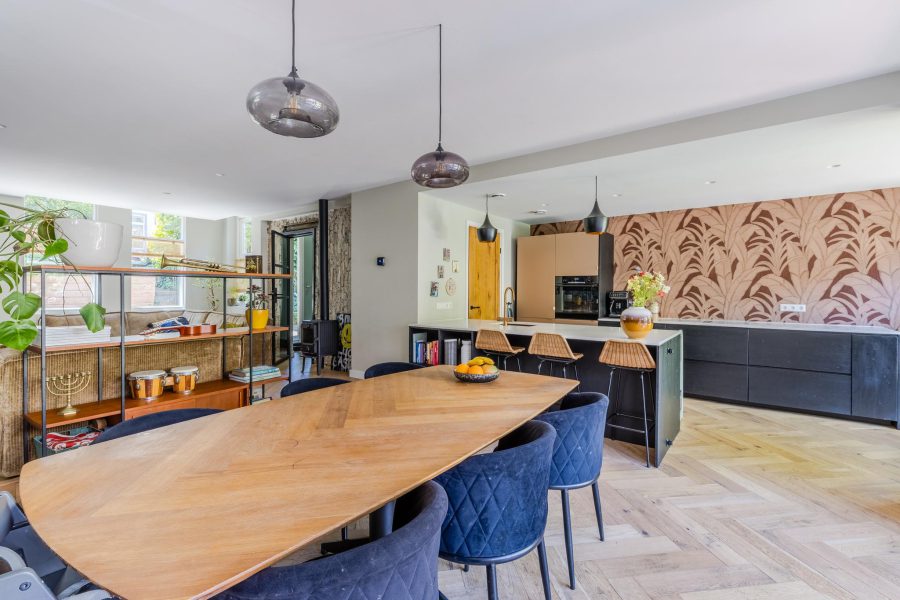 Via the embankment and the largely green front garden, you reach the lower house tucked between the greenery and the front door of the house. Entrance with cloakroom, staircase to the first floor, floating toilet with hand basin and access with a steel door to the living room with open kitchen. The bright, cosy living room has three windows at the front and a wide glass front with French doors to the back garden at the back. The beautiful, modern kitchen can also be found in the extended rear. The kitchen has black wood paneling and a light marble composite top. The kitchen has a sink peninsula with a breakfast bar for three. Cooking is electric. The kitchen has various built-in appliances, including a Selzius hot water faucet. The kitchen has a door to a storage/utility room. There is room here for the connection for washer and dryer. The living room with wood-burning stove has enough room for a spacious seating area and a dining table for six. The ground floor has a beautiful herringbone wooden floor with underfloor heating. The walls and ceilings are partly sleek and neural and partly decorative.