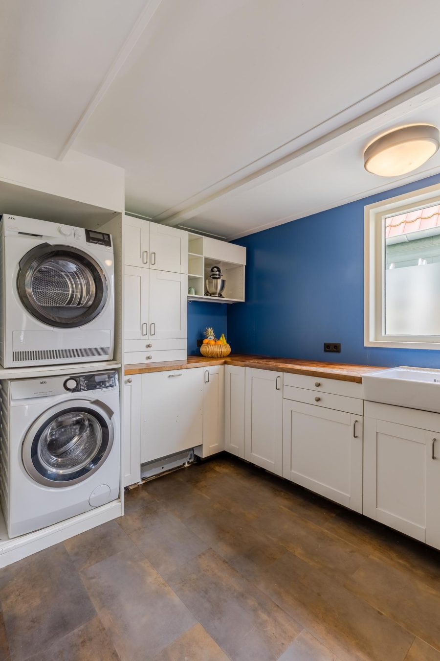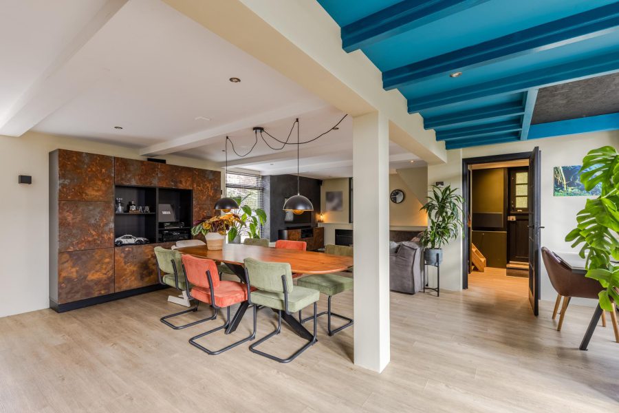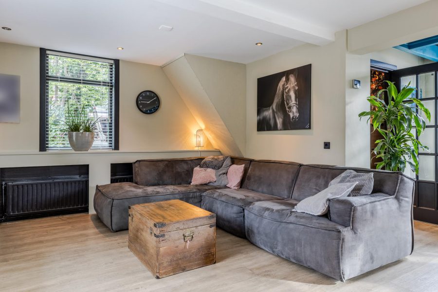 A pavement on the embankment leads to the sunken house via a footpath. Spacious front garden and side garden with access to the front door of the house. Entrance with expanded storage closet, staircase to the first floor and access to the bright, expanded and stylish living room with open kitchen. The living room has four windows and a front door to the garden. At the rear, you will find a sliding door to the back garden. In the room and the extension, the ceiling beams are visible. At the back of the living room you will find access to a bathroom and the spacious open kitchen. In the bathroom, you will find a vanity unit with mirror cabinet and basin, a bathtub with hand and rain shower and a floating toilet. The L-shaped kitchen has bright fronts and a beautiful six-burner cooker with oven. The kitchen also has a closet with washer and dryer. There is a nice pvc floor and the beams are visible. A very stylish and attractive unit.