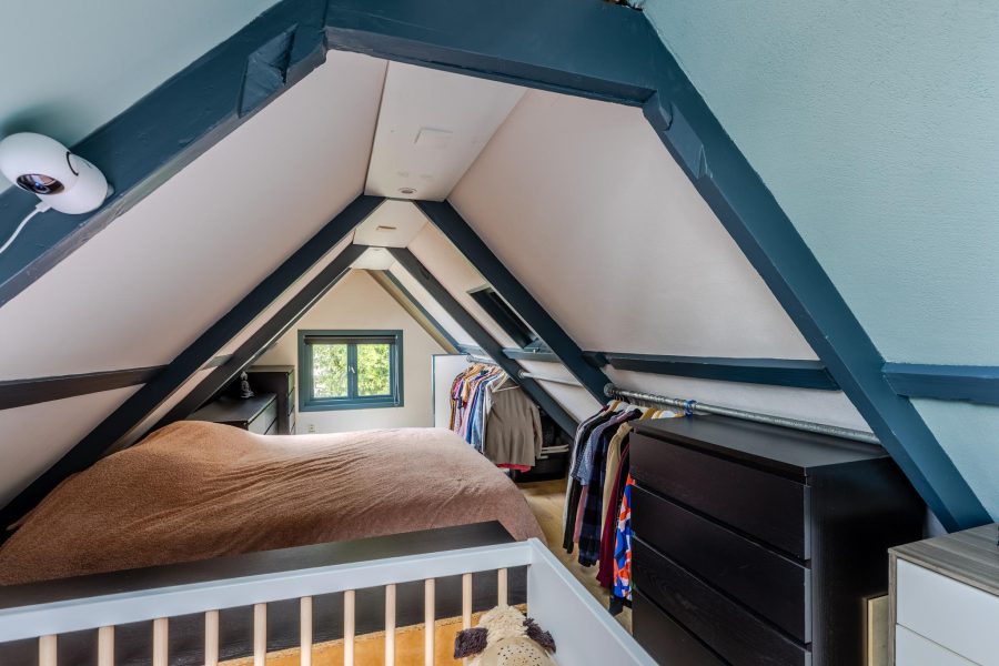 • Lichte eerste verdieping onder de balken met ruime overloop met kledingrekken, slaapruimte en een afgesloten slaapkamer