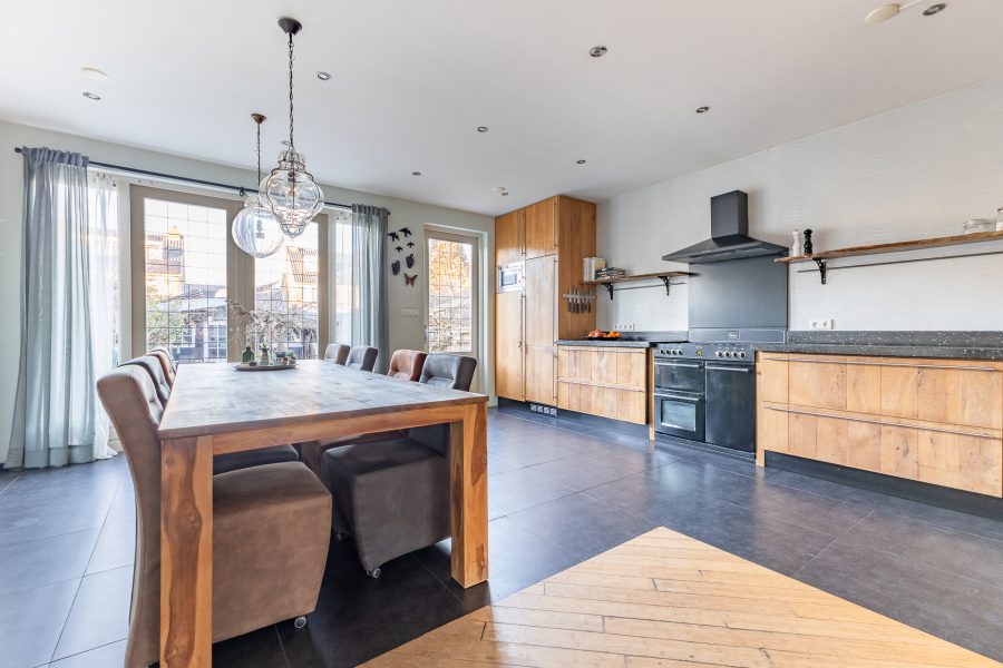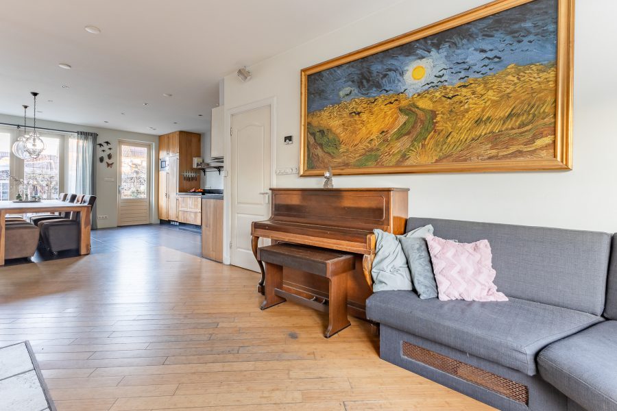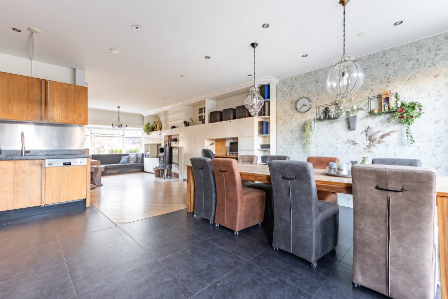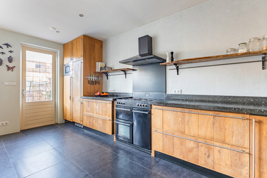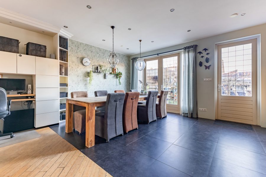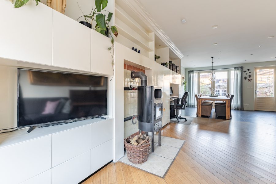 Through the mostly paved front garden you reach the covered front door. Entrance with meter closet and wardrobe, staircase to the first floor, floating toilet with hand basin and access to the living room with open kitchen. The bright living room has been extended and has a bay window at the front. There is also a fireplace with a cosy wood-burning stove. The living room has fixed closets and enough room for a spacious seating area and a work area. At the rear, the room has been extended with a spacious kitchen diner. Here there is room for a large dining table for cosy meals with family and friends. The kitchen has a door to the garden and French doors to a raised terrace. The spacious L-shaped kitchen has oak fronts and plenty of cupboard space. The following appliances are present: a dishwasher, an oven a microwave, a gas cooker, a Quooker and a fridge freezer. There is wood on the floor in the living room and tiles with underfloor heating in the kitchen.