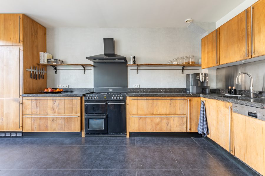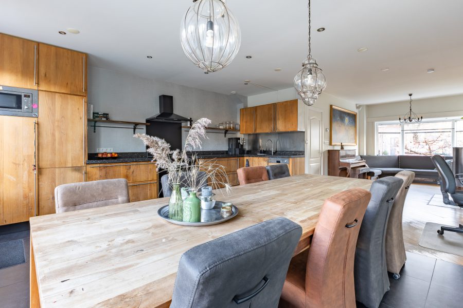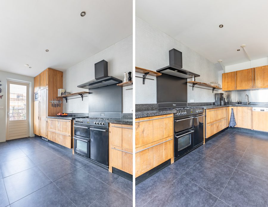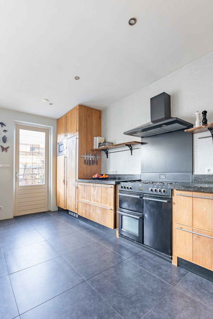 Through the mostly paved front garden you reach the covered front door. Entrance with meter closet and wardrobe, staircase to the first floor, floating toilet with hand basin and access to the living room with open kitchen. The bright living room has been extended and has a bay window at the front. There is also a fireplace with a cosy wood-burning stove. The living room has fixed closets and enough room for a spacious seating area and a work area. At the rear, the room has been extended with a spacious kitchen diner. Here there is room for a large dining table for cosy meals with family and friends. The kitchen has a door to the garden and French doors to a raised terrace. The spacious L-shaped kitchen has oak fronts and plenty of cupboard space. The following appliances are present: a dishwasher, an oven a microwave, a gas cooker, a Quooker and a fridge freezer. There is wood on the floor in the living room and tiles with underfloor heating in the kitchen.