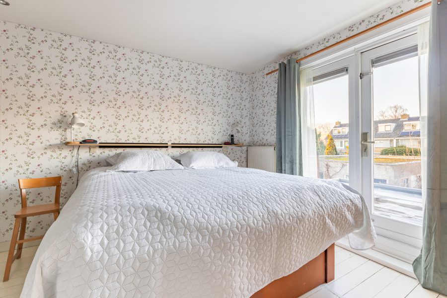 Via de trap bereiken we de overloop van deze verdieping. Hier zijn drie slaapkamers, een separaat toilet, een open kast met het witgoed en de badkamer te vinden. Een slaapkamer ligt aan de achterzijde en heeft openslaande deuren naar het dakterras. Naast deze slaapkamer ligt de licht betegelde badkamer. De badkamer is voorzien van een ligbad, een badmeubel met wastafel en spiegelkast, een designradiator en inloopdouche met regendouche. De badkamer is voorzien van vloerverwarming De twee overige slaapkamers liggen aan de voorzijde van de woning. Op de vloer van de slaapkamers ligt hout. De sfeervolle paneeldeuren zijn hier behouden.