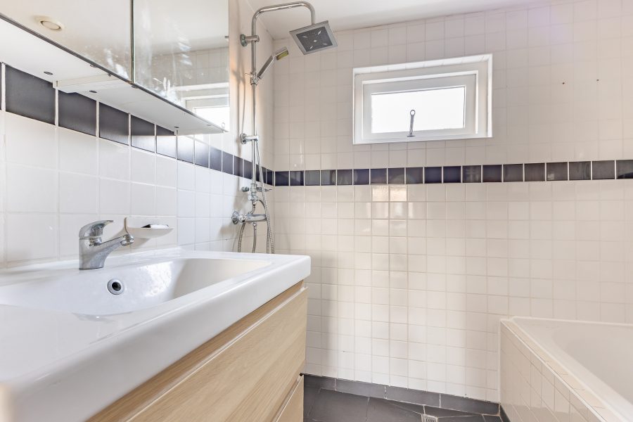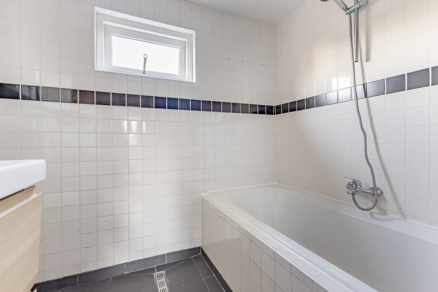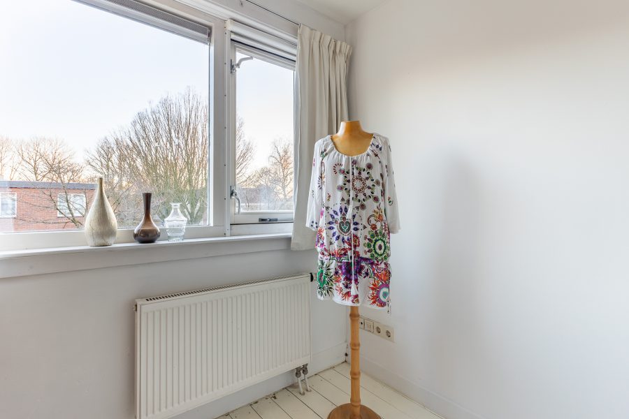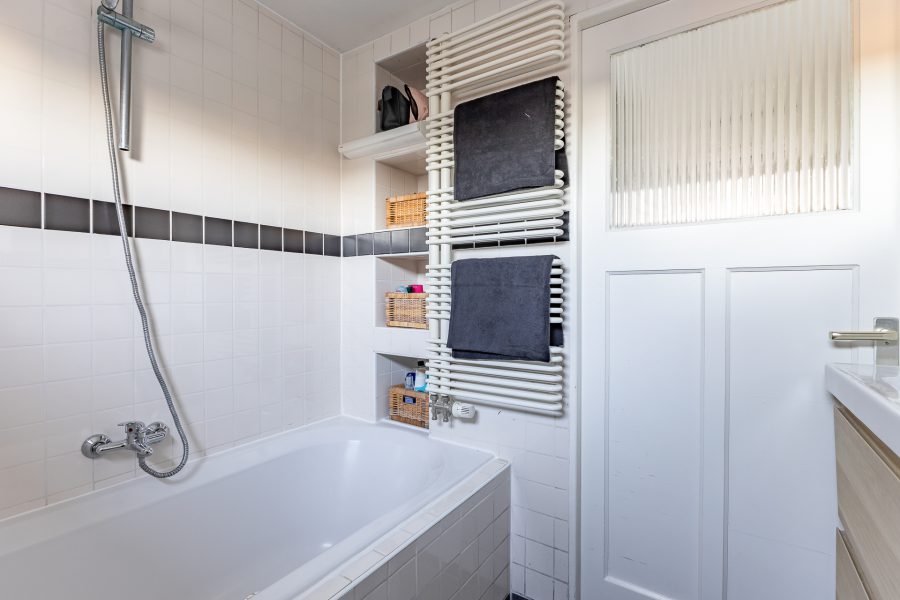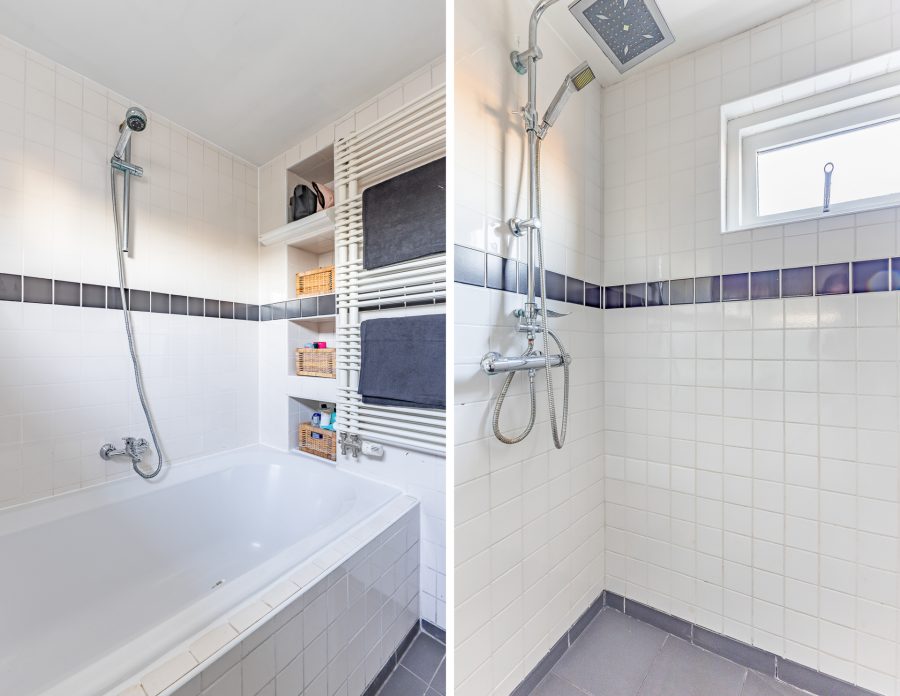 Via the stairs we reach the landing of this floor. Here you will find three bedrooms, a separate toilet, an open closet with the wsaher and dryer and the bathroom. One bedroom is located at the rear and has French doors to the roof terrace. Next to this bedroom is the lightly tiled bathroom. The bathroom has a bathtub, a vanity unit with sink and mirror cabinet, a design radiator and a walk-in shower with rain shower. The bathroom has underfloor heating The other two bedrooms are located at the front of the house. The bedrooms have wooden floors. The attractive panel doors have been retained here.