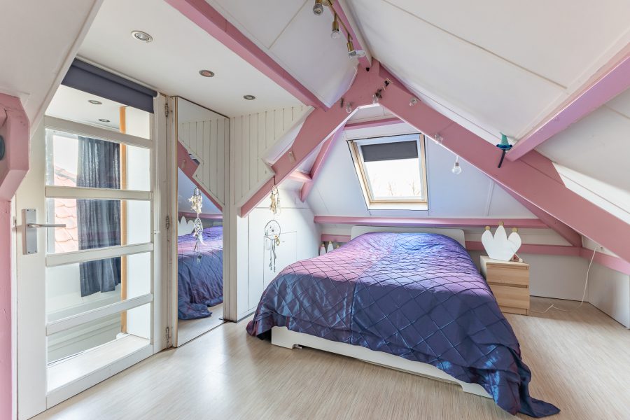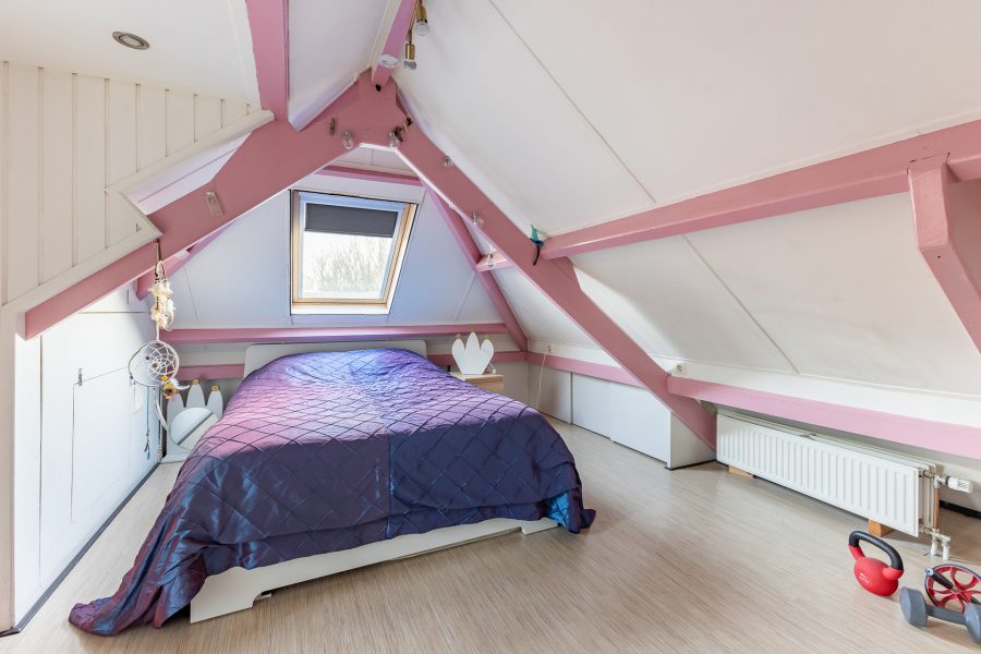 Via een vaste trap bereik je de overloop van deze verdieping. Deze heeft aan de zijkant een dakkapel. Je treft hier onder de plafondbalken de vierde slaapkamer aan en ook veel bergruimte. De slaapkamer heeft aan de voorzijde een Velux dakraam.