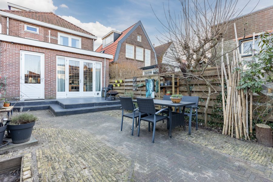 De woning heeft een voortuin en een achtertuin van 19 meter diep. Aan het einde van de tuin staat een ruime houten schuur met elektra van 26 m2. Deze ruimte is voor vele doeleinden geschikt bijvoorbeeld als hobbyruimte of atelier. Aansluitend aan de woning is een verhoogd betegeld terras te vinden en een loungeplek. Verder biedt de tuin tal van mogelijkheden. Als je van tuineren houdt is dit een paradijsje en kinderen kunnen hier heerlijk spelen. Er is een achterom.