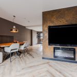 At the back of the house is the kitchen with a cooking island and a wall of cupboards. The kitchen has a modern, black design and is equipped with a dishwasher, hob, extractor hood, ovens, wine refrigerator, refrigerator, freezer and Selzius (kitchen with appliances installed in January 2022).