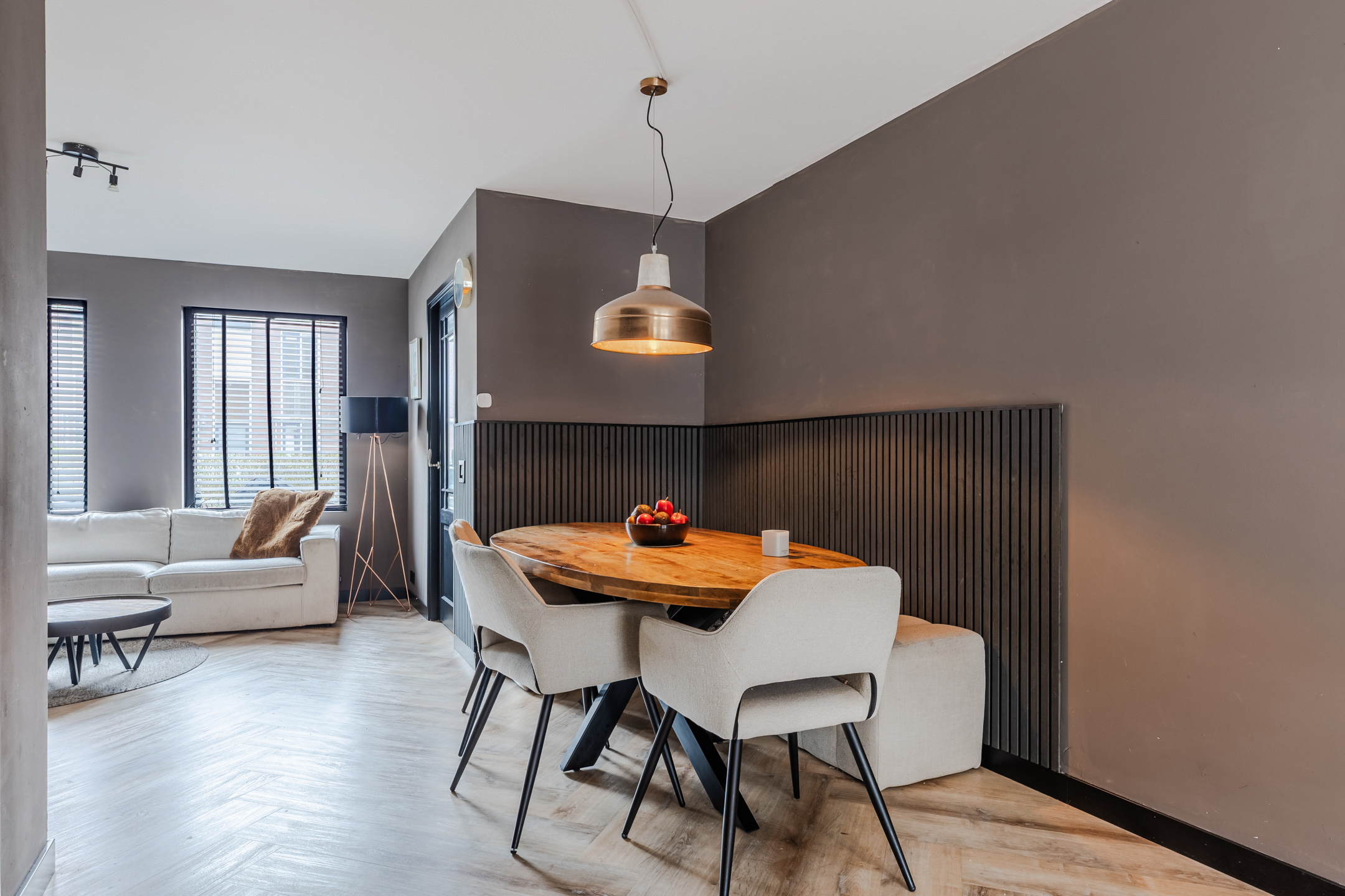 The tiled front garden leads to the front door of this beautiful, terraced house. Behind the front door is the entrance hall with meter cupboard and access to the living room. The living room has been extended at the back, making it wonderfully spacious (The living room was completely plastered in December 2021). This room has been finished with a beautiful herringbone floor (December 2021) equipped with underfloor heating (installed in December 2021). Thanks to the large windows and garden doors, there is plenty of natural light. The extension has a suspended ceiling with recessed spotlights (suspended ceiling with spotlights installed in December 2021).
