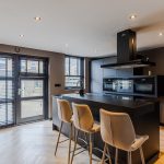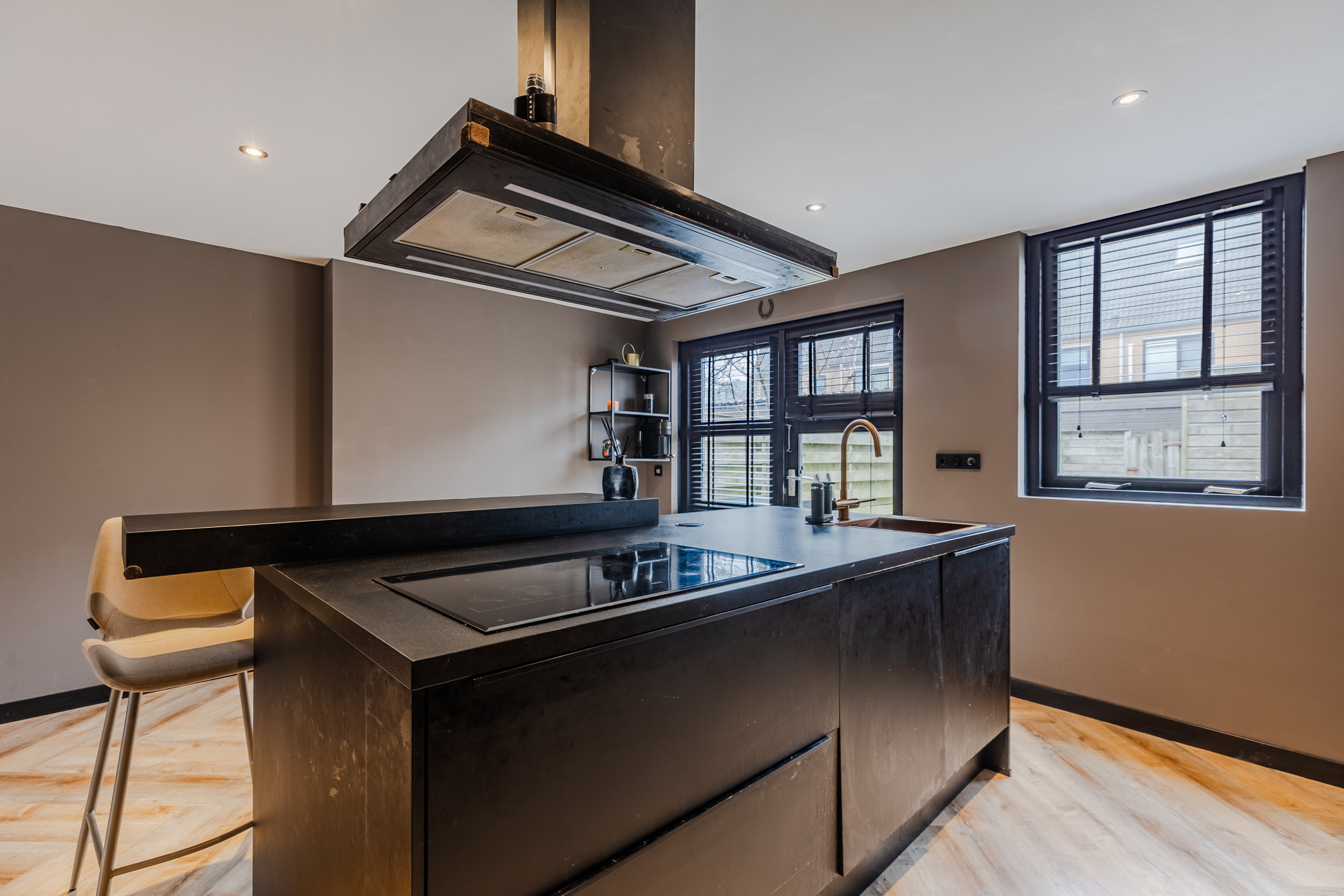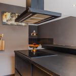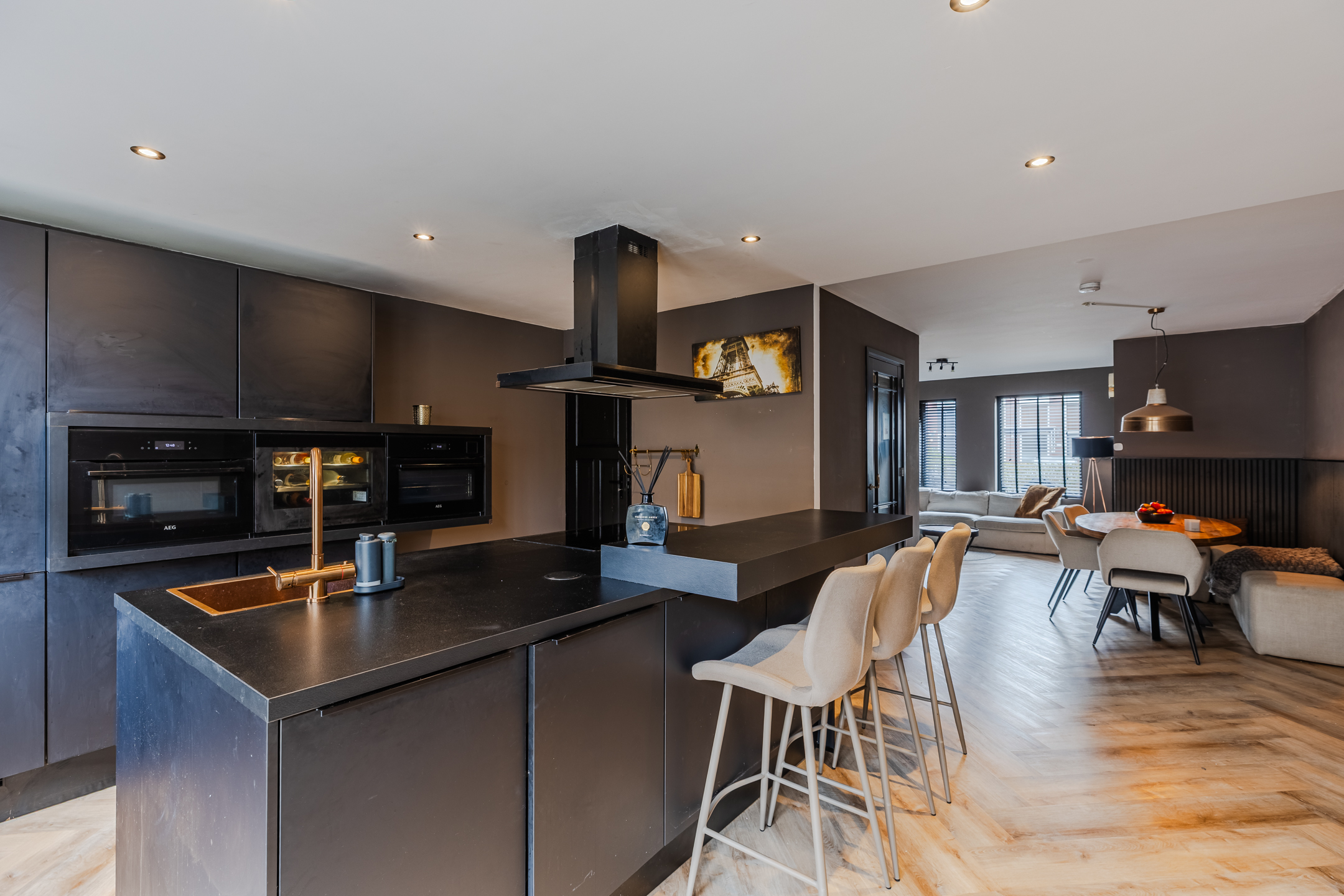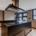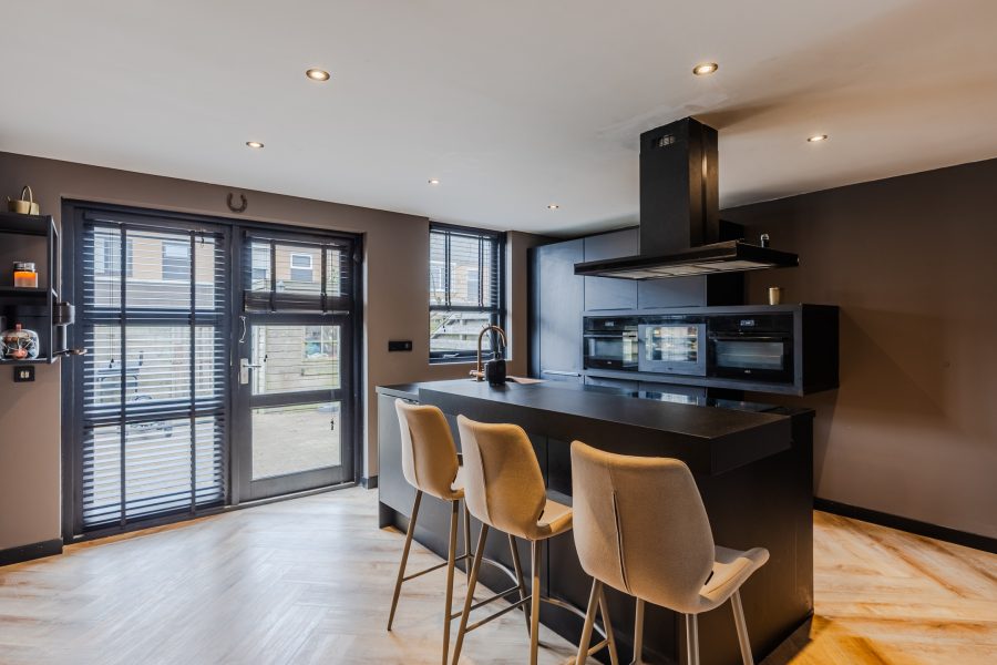Aan de achterzijde van het huis bevindt zich de woonkeuken met kookeiland en een kastenwand. De keuken heeft een modern, zwart design en is uitgerust met een vaatwasser, kookplaat, afzuigkap, ovens, wijnkoelkast, koelkast, vriezer en Selzius (keuken met apparatuur geplaatst januari 2022).