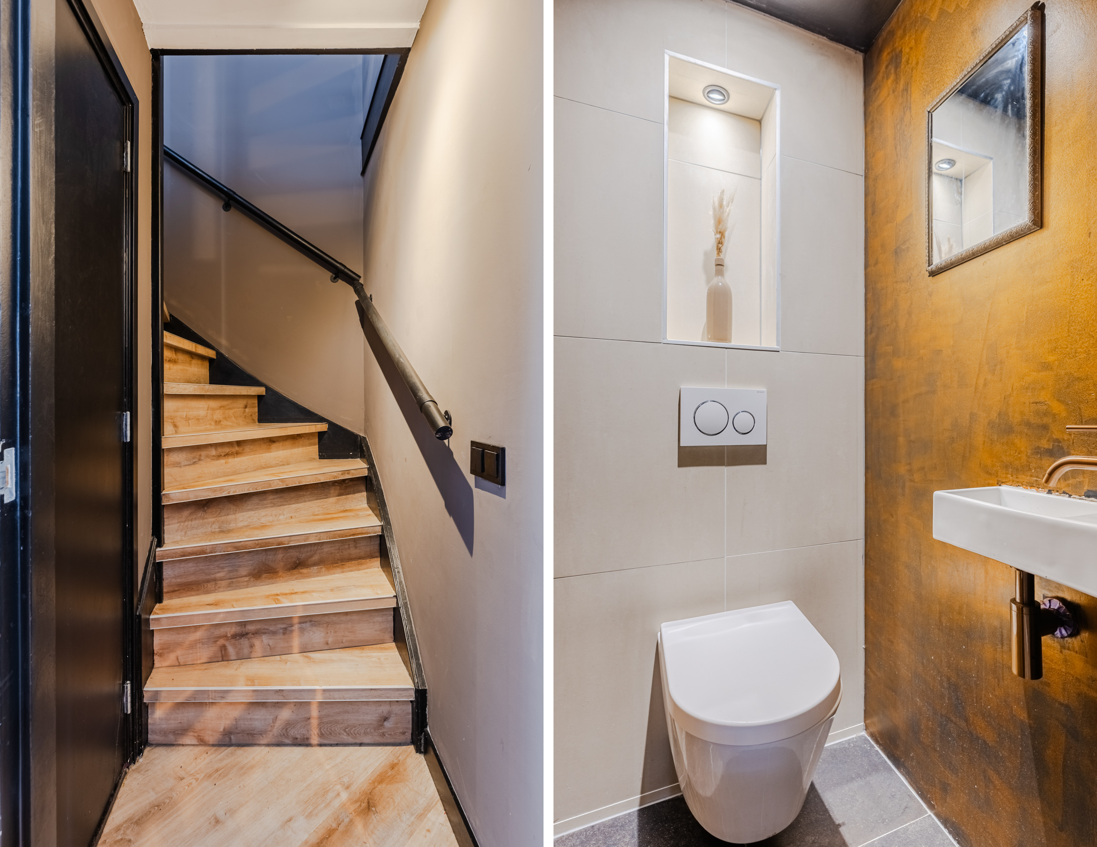 De woonkamer biedt verder toegang tot een kleine hal. Vanuit hier bereik je de trap naar boven en een toiletruimte met zwevend toilet en fonteintje (toilet renovatie december 2021).