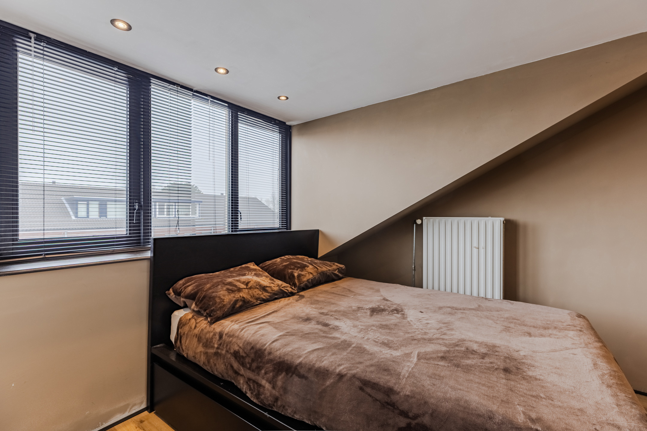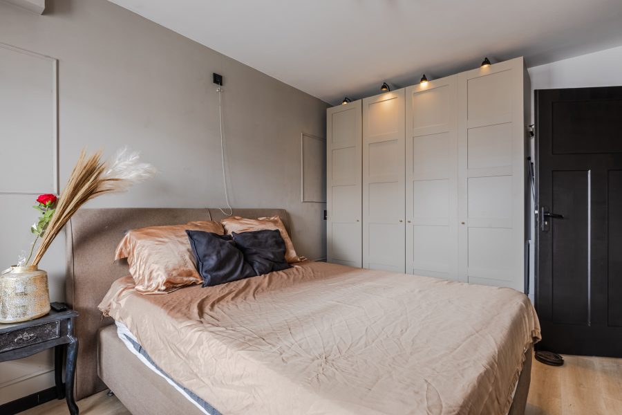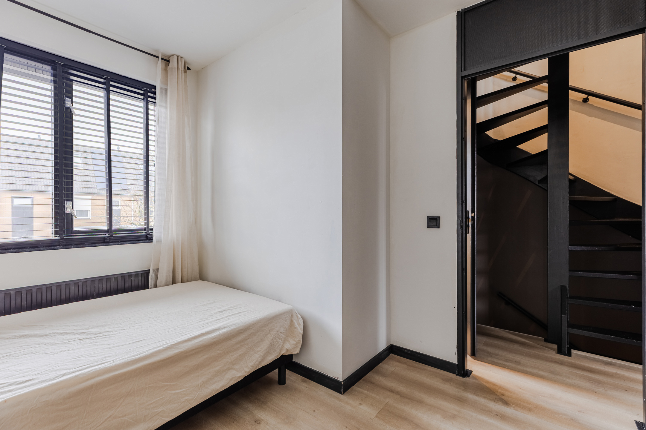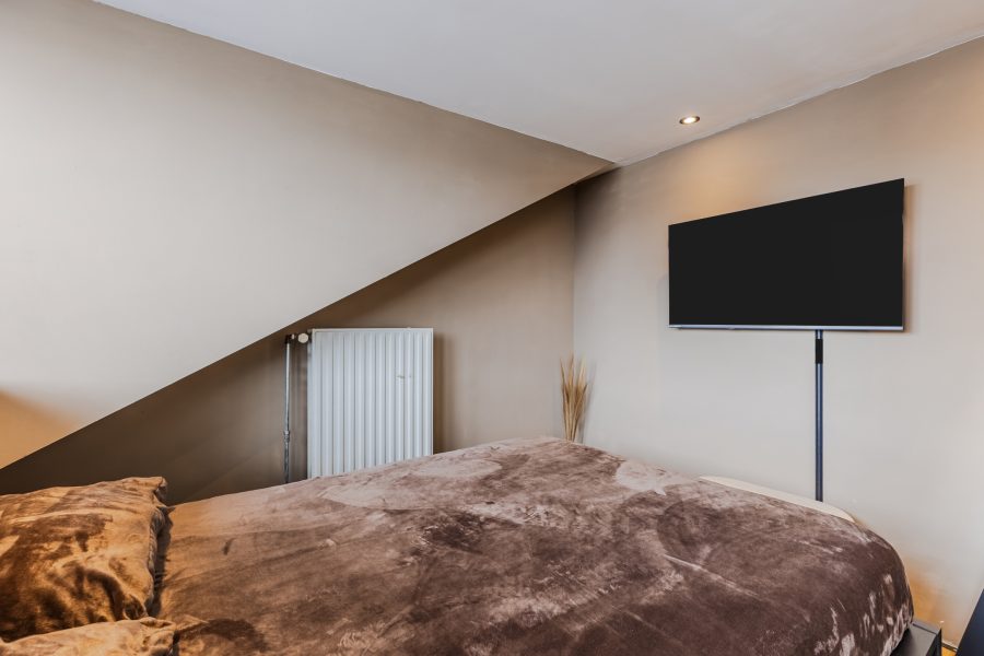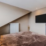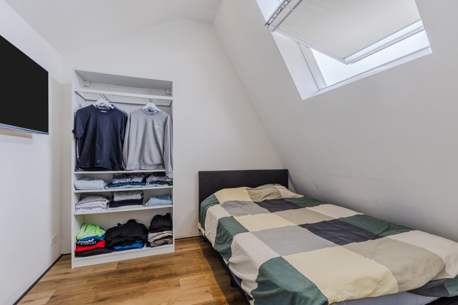 A fixed staircase provides access to the spacious landing on this floor. Here you will find the connections for the washing machine and dryer. From the landing, you can reach the fourth and fifth bedrooms (complete attic renovation and plastering in 2023). Both rooms have neat flooring and sleek walls. Thanks to the dormer window at the front, this bedroom is wonderfully spacious and light. This room is also lit by recessed spotlights.