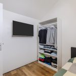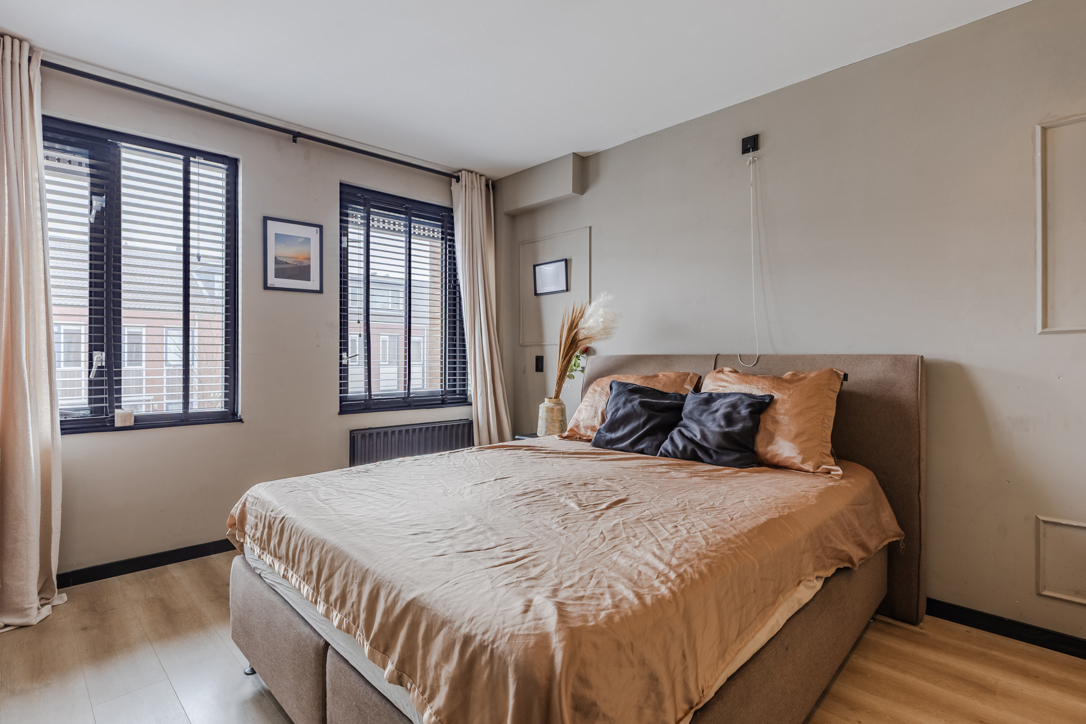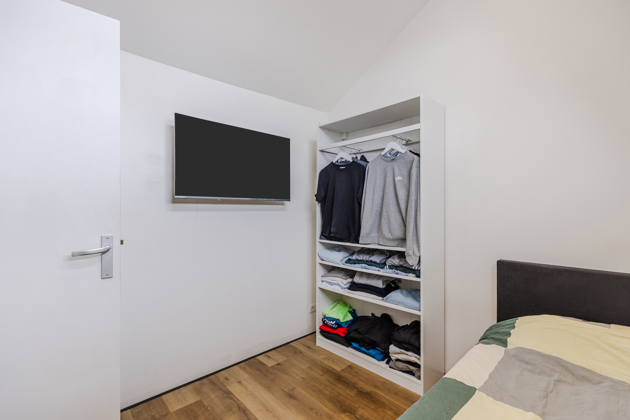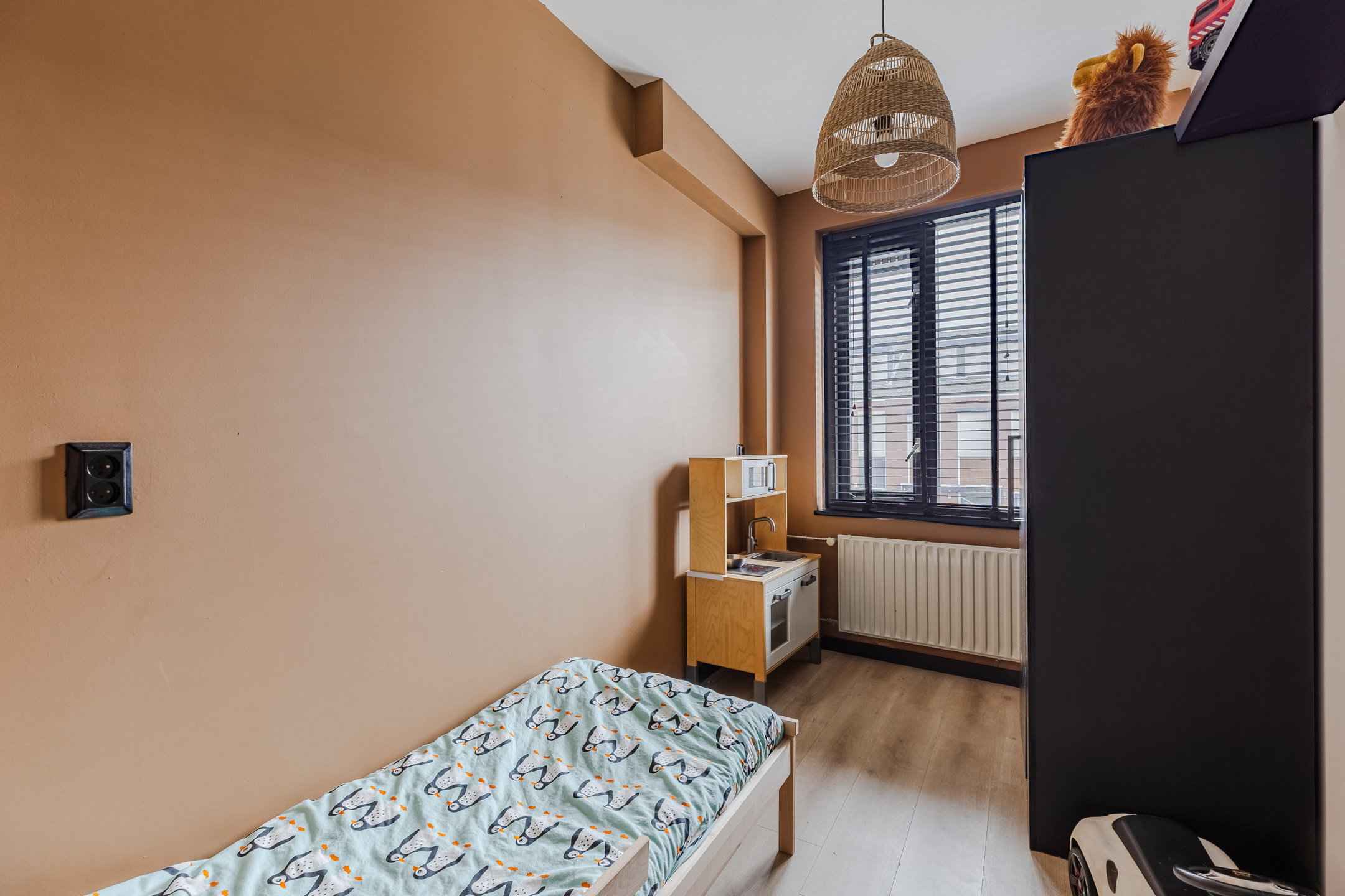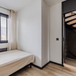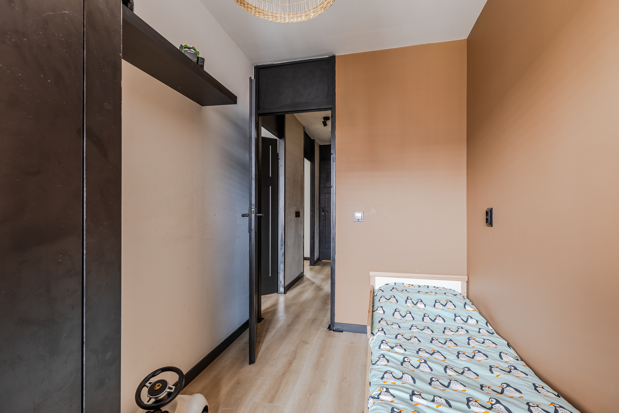 A fixed staircase provides access to the spacious landing on this floor. Here you will find the connections for the washing machine and dryer. From the landing, you can reach the fourth and fifth bedrooms (complete attic renovation and plastering in 2023). Both rooms have neat flooring and sleek walls. Thanks to the dormer window at the front, this bedroom is wonderfully spacious and light. This room is also lit by recessed spotlights.
