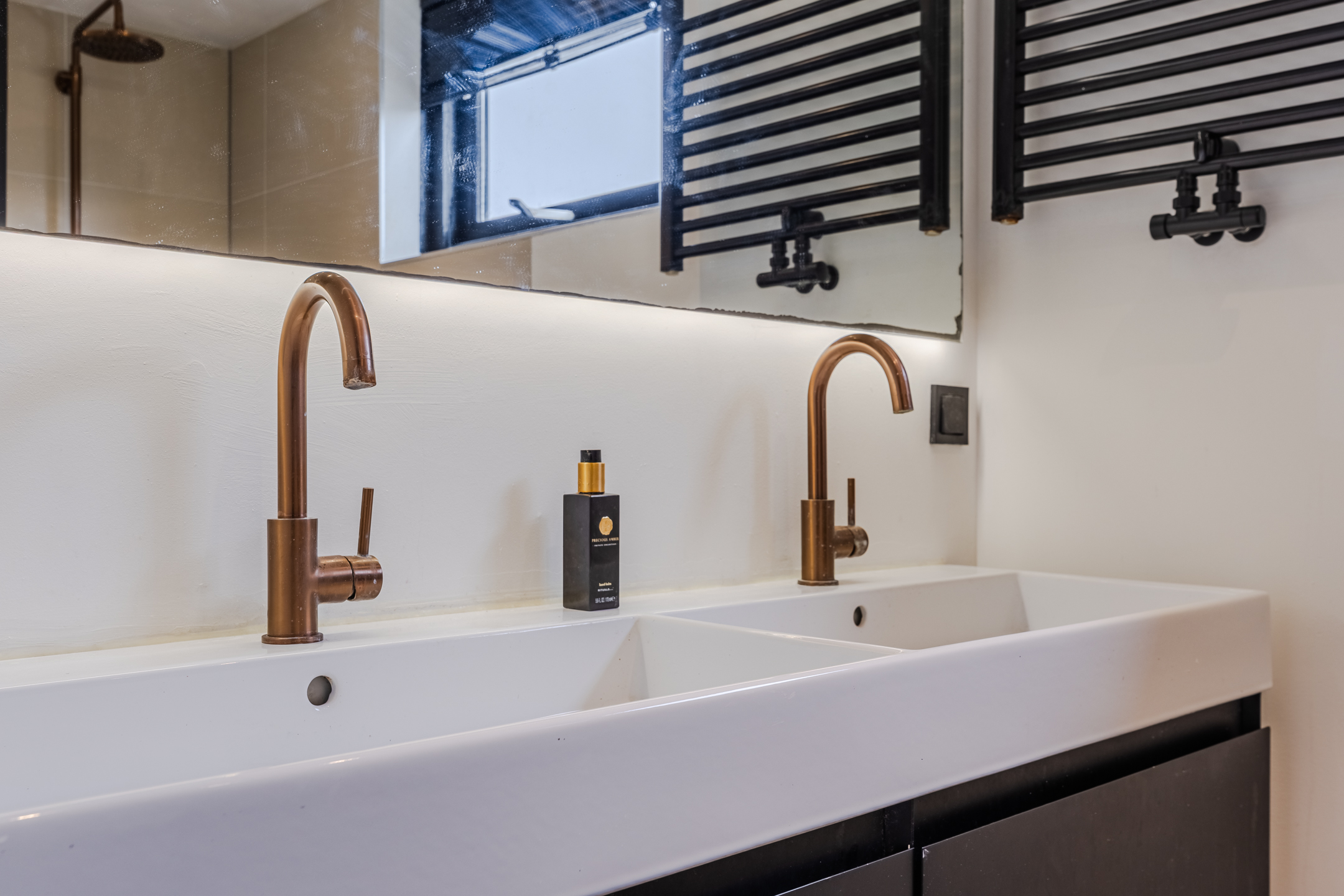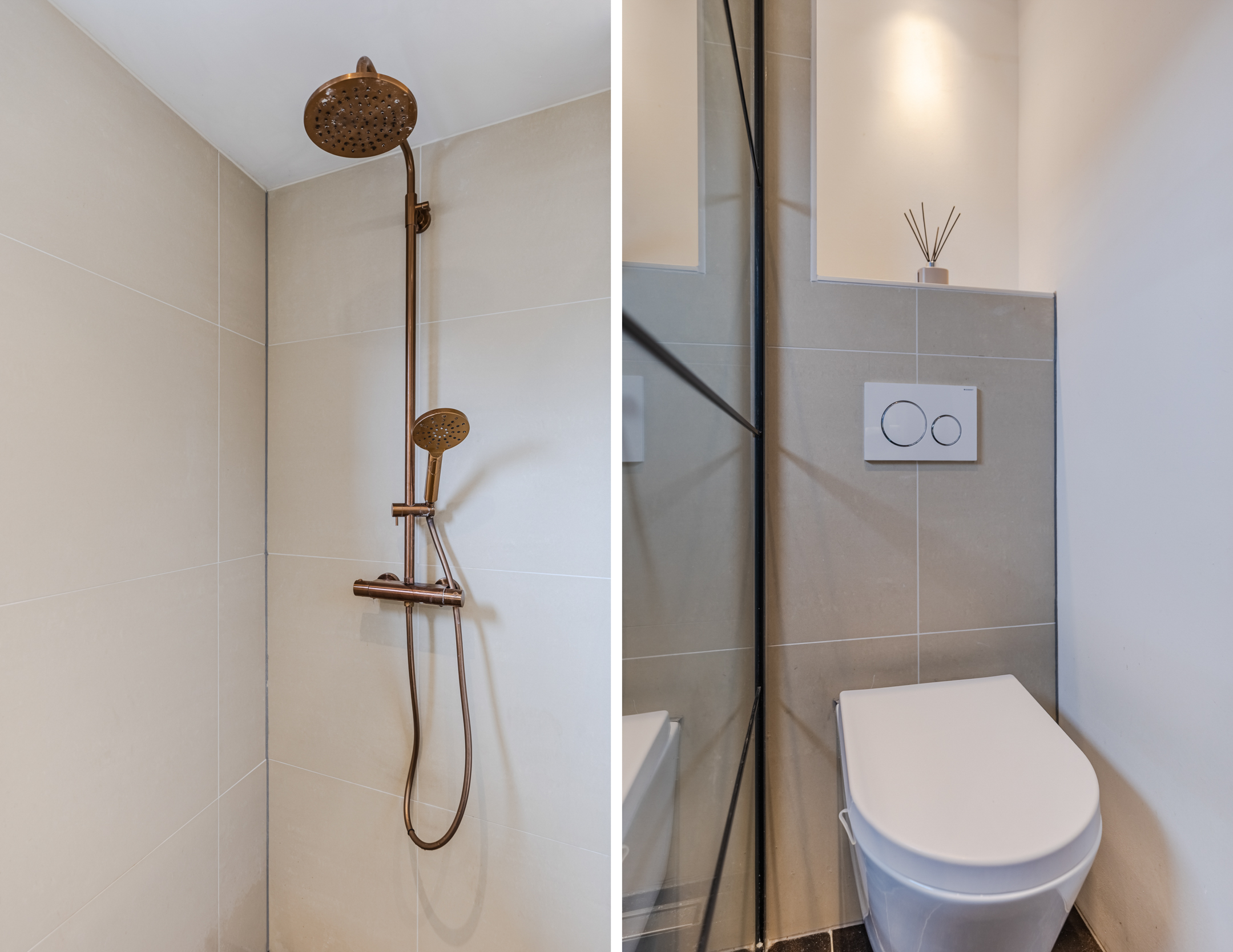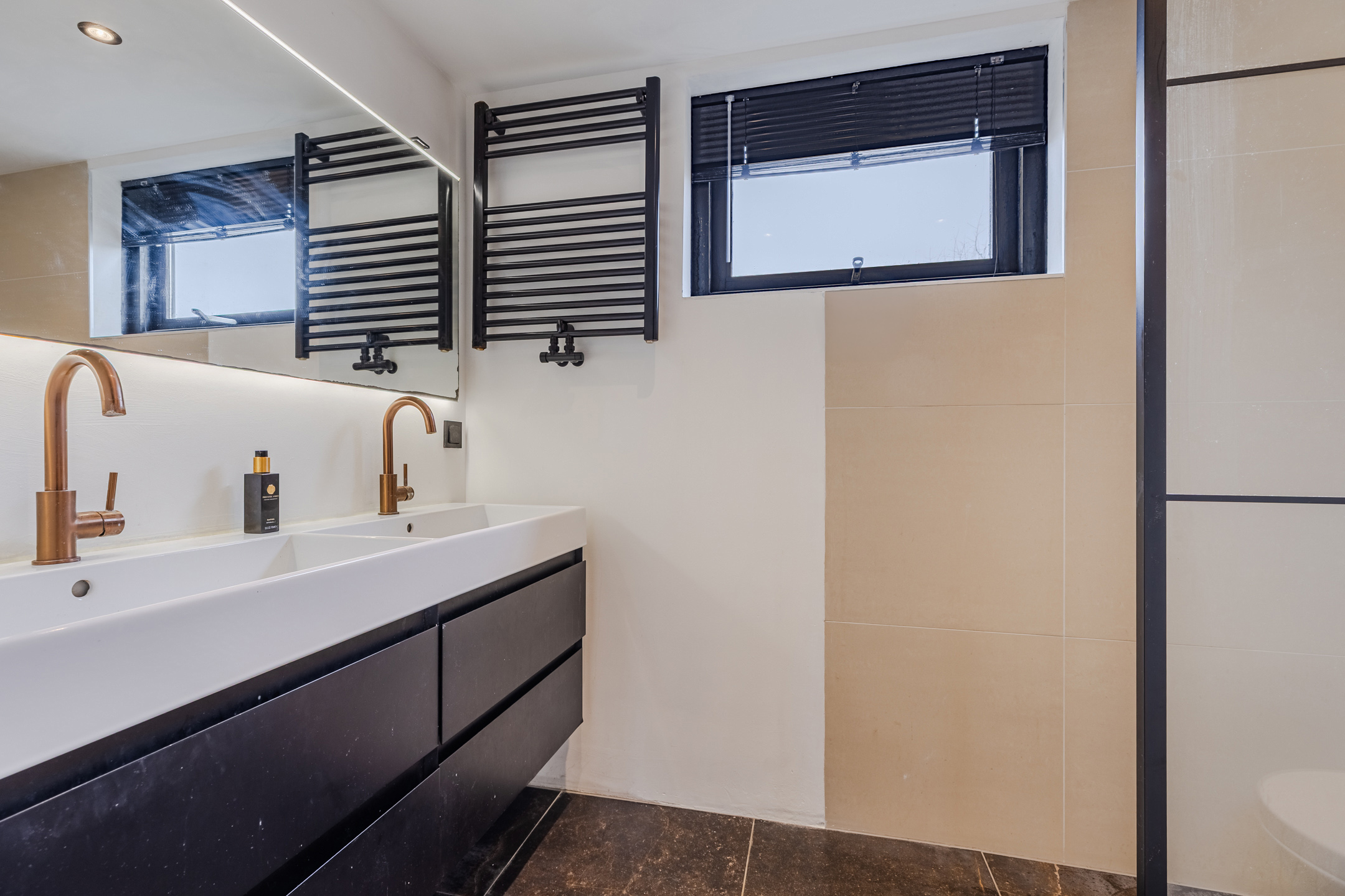 • Keurig verzorgde badkamer met toilet, dubbele wastafel en inloopdouche