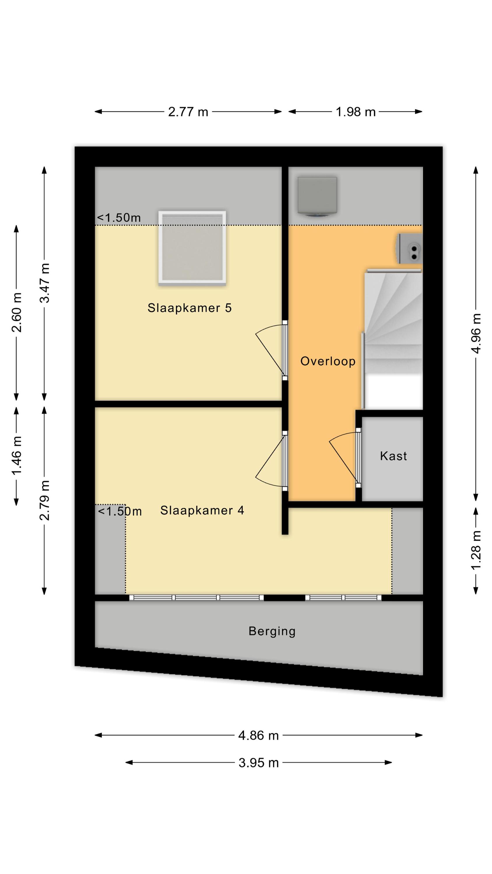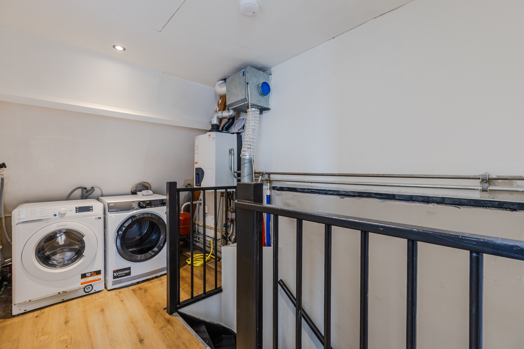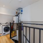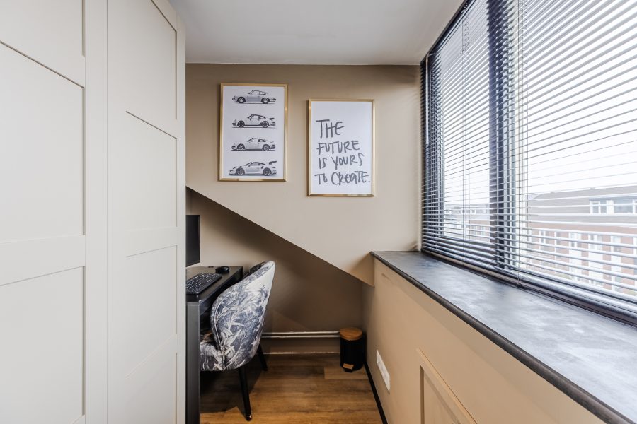 Een vaste trap geeft toegang tot de ruime overloop van deze verdieping. Hier bevinden zich de aansluitingen voor de wasmachine en droger. Vanaf de overloop bereik je de vierde en vijfde slaapkamer (volledige zolder renovatie en gestuukt 2023). Beide kamers beschikken over een nette vloer en strakke wanden. Dankzij de dakkapel aan de voorzijde is deze slaapkamer heerlijk ruim en licht. Verder wordt deze kamer verlicht met inbouwspots.