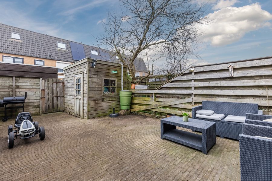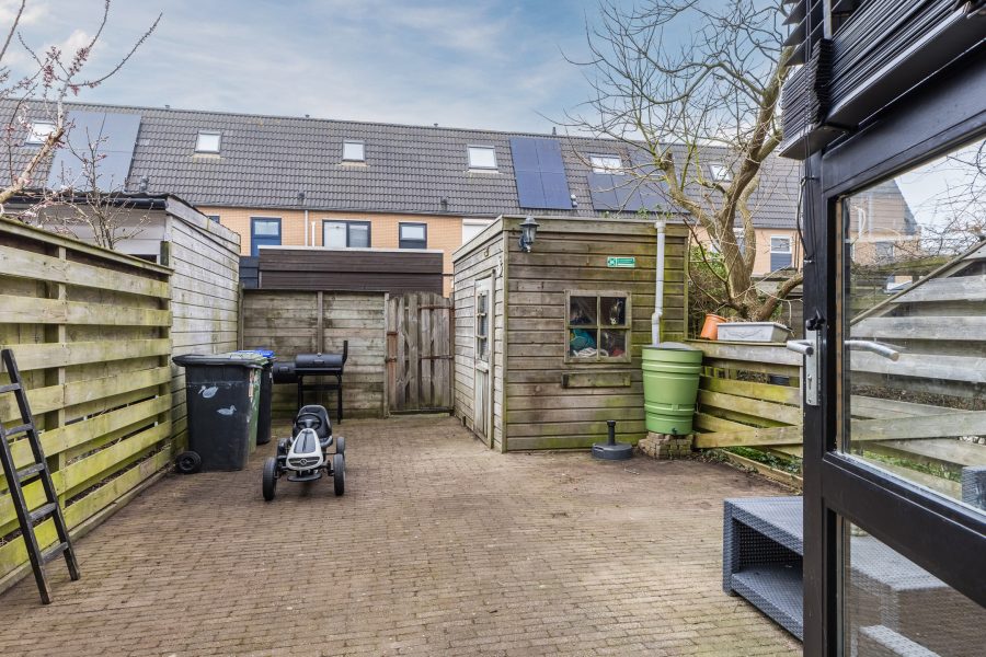 Het huis beschikt over een diepe, zonnige achtertuin. De tuin is bestraat en biedt genoeg ruimte voor een gezellige loungehoek. Dankzij de houten schuttingen rondom profiteer je van veel privacy. Hier kun je in alle rust van het zonnetje genieten! Achterin de tuin bevindt zich een houten berging met voldoende plek voor tuinspullen en fietsen. Daarnaast is er een achterom aanwezig.